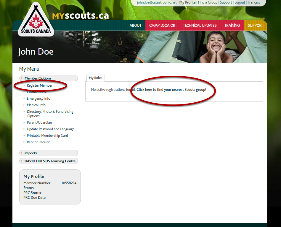 To register as a Volunteer or to register a Participant, select "Click here to find your nearest Scout Group" or "Register Member".